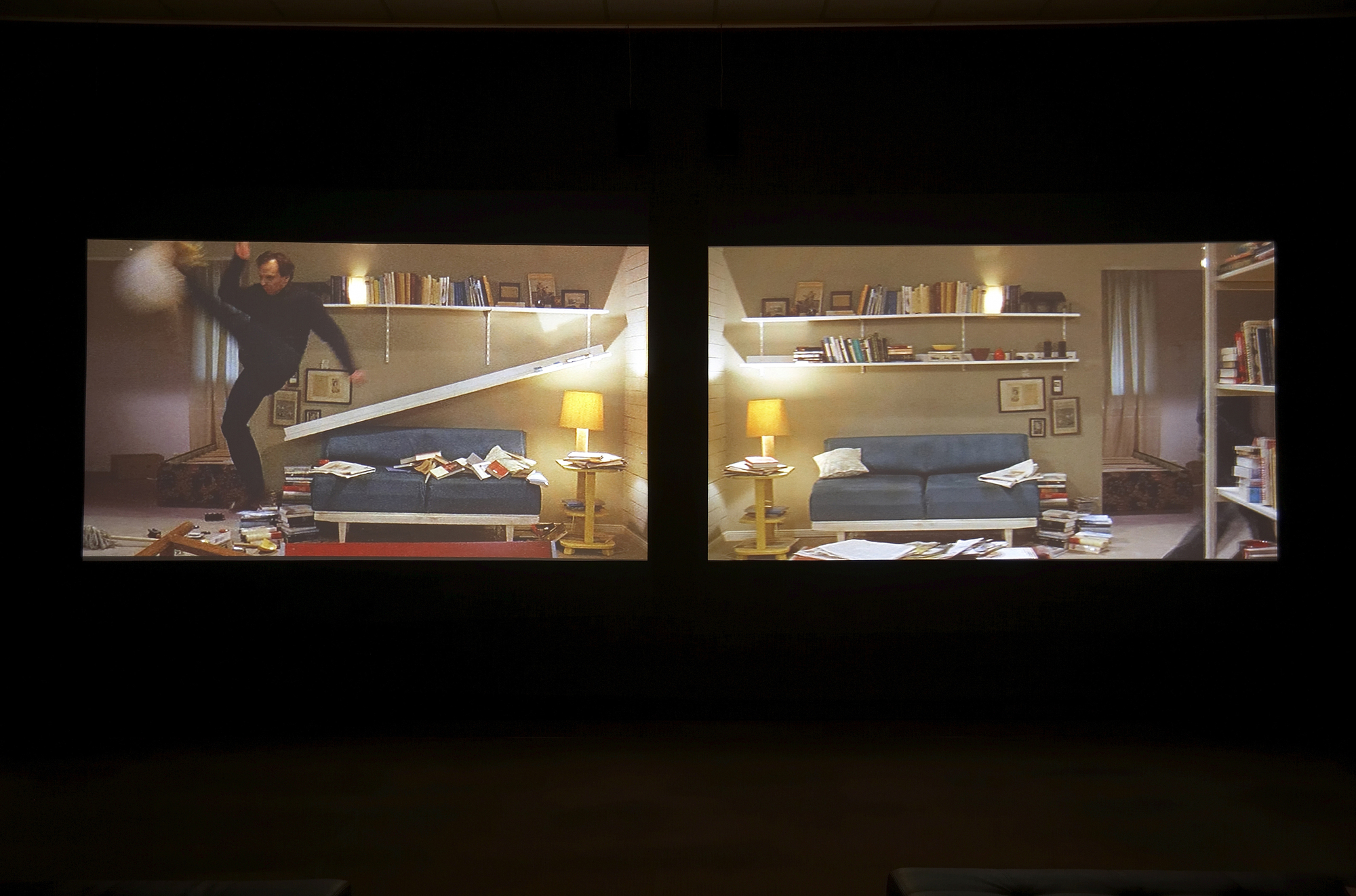 Stunned Man (2004) shows a young man vandalising his apartment, which is then assiduously reassembled by his alter ego, only to be destroyed once again. As in the first part of the trilogy, the room is recognisable as a film set and neglects the cinematic effect of illusion. The wordplay of the title refers, like The Soundmaker (2004), to a film profession pursued more or less behind the scenes: the stuntman.