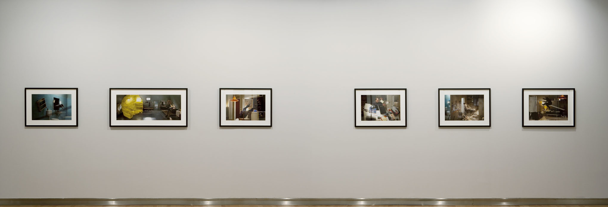 The photo works were created in the context of the film installation Stunned Man (2004). It's the second part of Rosefeldt’s Trilogy of Failure (2004/2005) in which three different settings draw a picture of our vain entanglement with everyday rituals. In each case the protagonist is caught up in a microcosm that suggests mental and spatial claustrophobia. As a reaction to the hopeless situation, he plunges into permanent Sisyphean activity – going nowhere and producing nothing. The motifs of perpetual attempt and constant failure find their equivalent in the repetitive structure of the loop. The scenes are allegories of our frantic and ultimately futile attempts to escape the surrounding norms, constraints, structures and rituals by which we are determined.